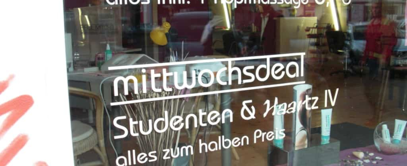 Berlin has an unemployement rate of approximately 20%. The German “support money” is called Hartz IV. Basicly the tax payers pay for your apartment (up to 350 Euros) and you get about 300-350 Euros to live. That can make it a quite nice life in Berlin especially if you consider the cheap rent and cheap food prices here. A lot of university students live from less money this is why this add by a hairdresser is not really surprising: