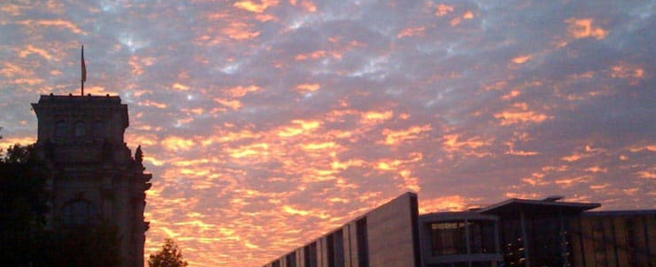 Yesterday evening, Berlin was a place just a stone’s throw away from Oahu, Hawaii – at least as far as the spectacular sunset was concerned. When you looked up from street level, you saw people staring at the sky in amazement from their 3rd-floor balconies. Me, I stared up in amazement from a small boat taking a wedding party of about 35 guests along the river Spree in an evening cruise. Those river cruises sound extremely no-go touristy, but every Berliner who has ever overcome his cool and taken one, e.g. forced by visiting parents, will contest that it’s a really striking experience – touristy or not.
