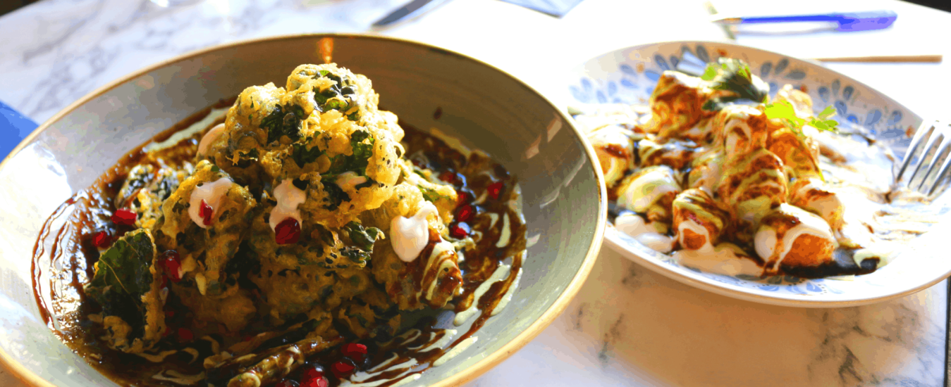 The first two plates were sweet potato chaat and crispy, battered kale, each smothered in a swirling mix of mint yogurts, tamarind chutneys and pomegranate.