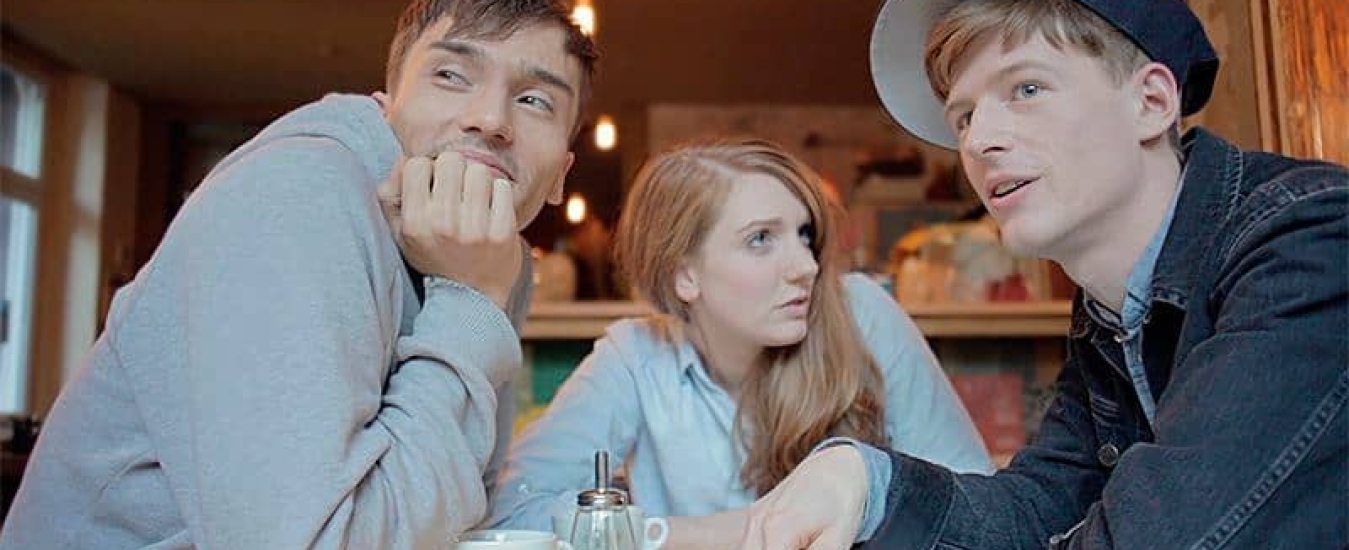 Ihr dreht eure beiden süssen Köpfe einmal nach links und rechts und dann baut ihr das ganze promt nochmal mit miesen Schauspielern, hakenden Gags und gekünstelter zeitgeistiger Alltagssprache nach: Parties, kalter Kaffee (in allen Aspekten), dreckige WG-Küchen, Zukunftsangst, Anglizismen, Selbstfindung, peinlich daneben liegende Musik- & Kulturreferenzen („Nickelback“), Wer-ficken-will-muss-freundlich-sein Beste-Freundin-Tipps (das hat „Absolute Giganten, auch wenn ich mich schäme diesen Film überhaupt in dem Kontext hier anzubringen, aber leider alles um Lichtjahre besser gemacht, bzw: der hat das ALLES richtig gemacht. Und ihr… nicht.), Club Mate muss natürlich auch nochmal herhalten – logisch, dann noch Flomarkt, WG-Tatort Glotzen, Kleiderkreisel, Späti, Vernisage, Künstler-WG, Ausstellungen, Prokrastination, die richtigen Club-Namen, etc. Die Liste könnte mit maximaler Leichtigkeit unendlich weitergeführt werden. Bleibt zu hoffen, dass eurem Projekt (und uns) genau das hoffentlich erspart bleibt und eure erste „Folge“ als beispiellos dröge Totgeburt ganz fix vergessen wird.