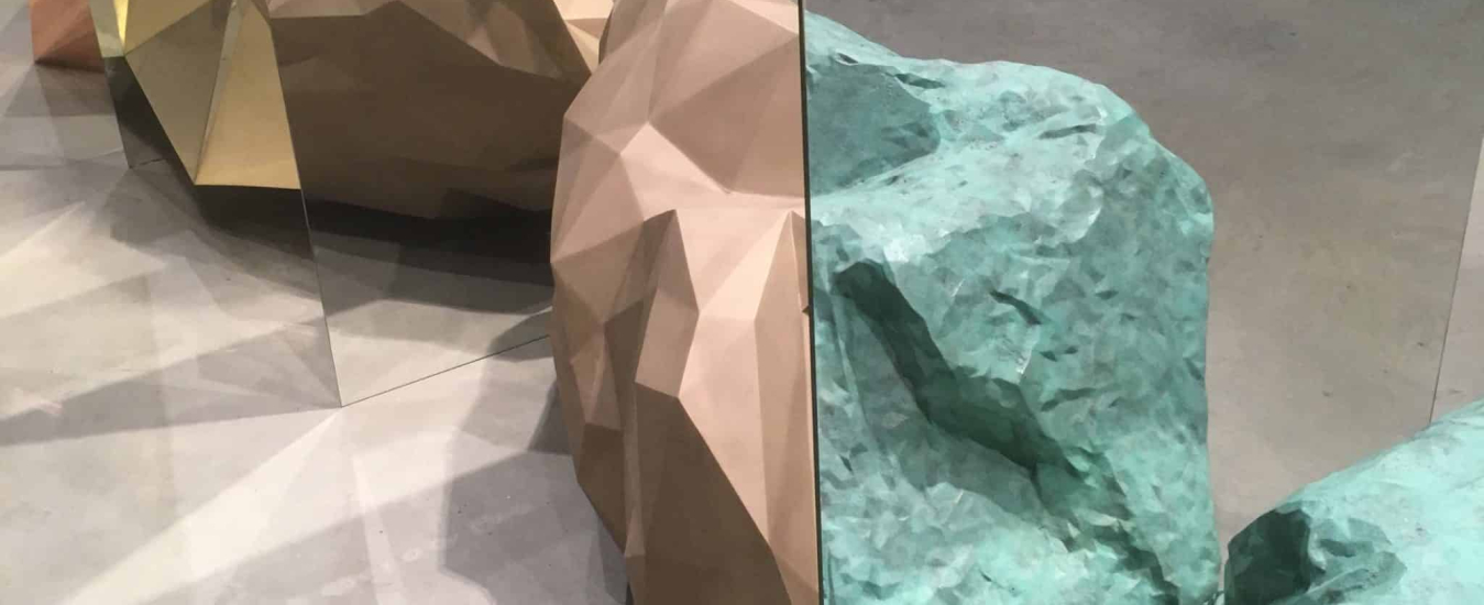One of my favourite piece of the exhibition, Trans-For-Men 8 (Fibonacci) deconstructs the essence of a stone, replicating it in eight different versions, aligned and separated by mirrors. Each version acts as a “state” of the stone, transforming into a perfect black marble sphere on one side and a shiny copper octahedron on the other. As the shapes shift and the materials contrast, the mirrors act both as thin separations of alternate realities and as visual connectors. Each mirrored reflection bridges to the next object, creating an incredible physical continuity between the different shapes.