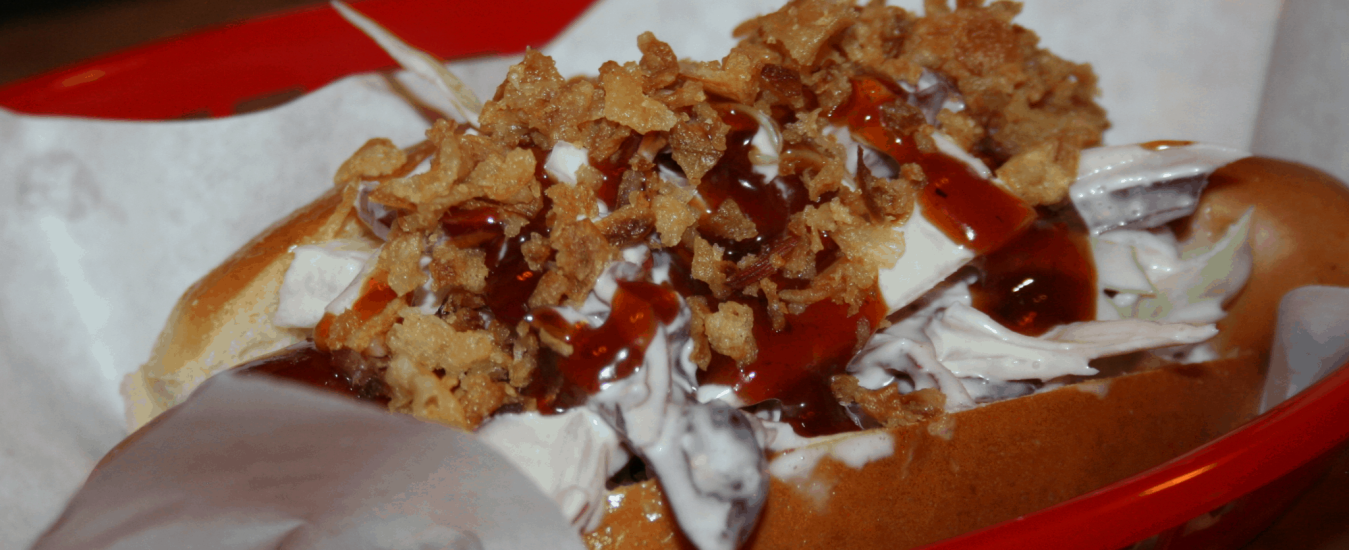 Bourbon Dog – Classic Dog topped with house recipe coleslaw, Rittenhouse Rye BBQ Sauce & crispy onions