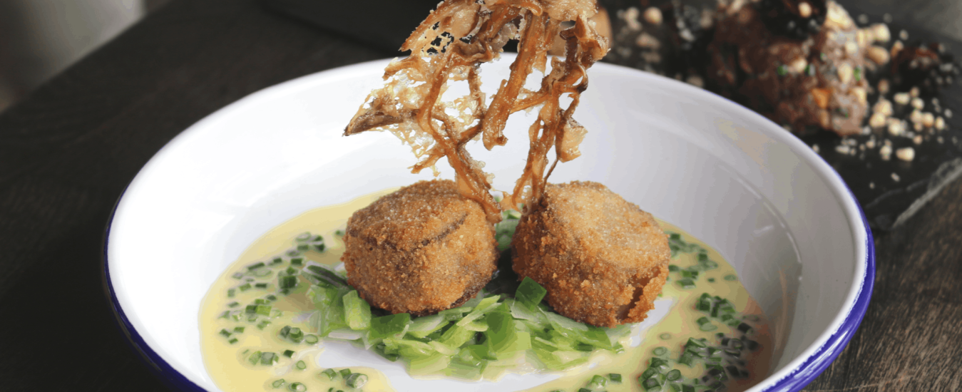 Our next round of small plates featured haggis bon bons with creamed neeps (swede/steckrüben) and ‘Game Chips’, and breaded pig’s head served with leeks, butter sauce and a fried pig’s ear as garnish.
