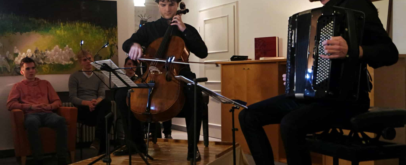 Als die beiden Musiker Andreas Borregaard (Akkordeon) und Gabriel Schwabe (Violoncello) zu spielen begonnen wurde schnell klar, der begrenzte Raum und die ungewohnte Atmosphäre schmälerten das Musikerlebnis keinesfalls. Vielmehr boten sie die Möglichkeit ein besonderes Konzert hautnah zu erleben. Das Duett spielte Stücke von Bach und ‘In Croce’ von Sofia Gubaidulina und stellte das Können unter Beweis die Zuhörer, auch auf engstem Raum, in Bann zu schlagen.