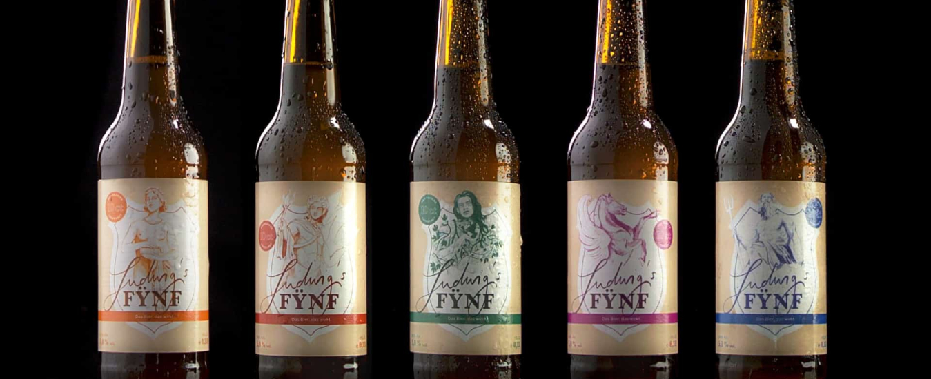 Ludwig’s FŸNF is a Berlin brother-and-sister startup beer brand which offers a single Helles beer in five different bottles. Each bottle’s label represents a different facet of the world, and each bottle sold sends 10cents to charities working within those specific fields.