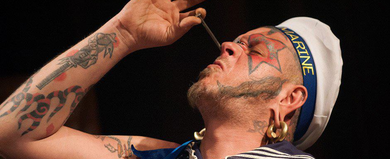 He’s the jolly goofball in the midst of the fetishists and pain-proof paragons. Even if he’s snapping a mousetrap shut on his tongue, his shows aren’t really about pain. It’s more something about good old-fashioned showmanship, the art of the grift, getting an audience in the game. Lately, his schtick has been to take mundane everyday objects – clothespins or rubber gloves or a tennis racket – and turn them into outrageous, hilarious stunts. He’s an alchemist on stage, with the uncanny ability to make the ridiculous into something sublime.