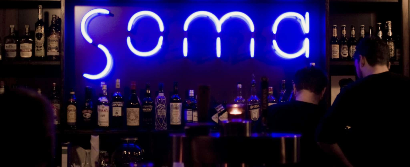 Gin/One Part Vermouth Rosso/One Part Campari. The Negroni is a rebel on Soma’s cocktail menu, supplanting sweet and smokiness with pure bitterness. It’s a zesty civilised drink at first, that glows red in the candle light and imparts a lasting bitterness on your lips.