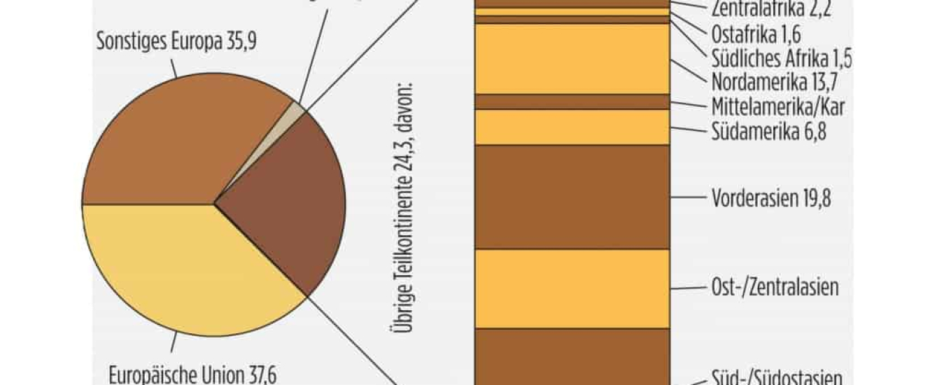 Every fifth foreigner comes from Turkey at 100,203 people. Second in line at 48,756 is Poland, followed by 21,182 from Italy, 18,536 from Serbia, 18,431 from Russia, 17,150 from Bulgaria, 15,838 from France, 12,262 from Spain, 11,931 from Britain, 11,302 from Greece, and 10,224 from Austria.